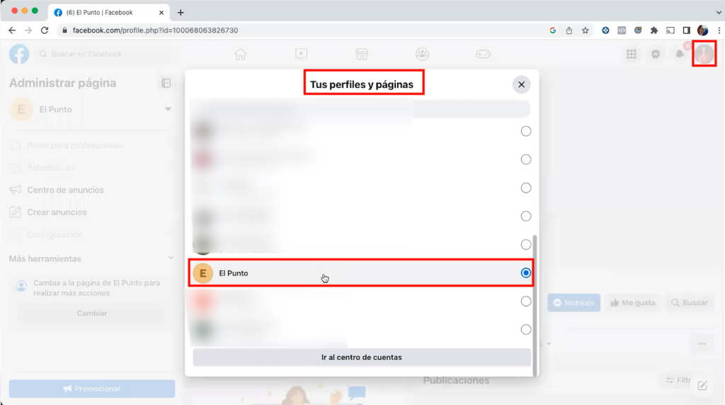 - Inicia sesión en tu cuenta de Facebook y selecciona la página que deseas editar en la sección de páginas.