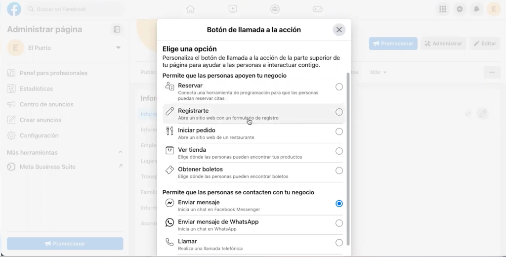La nueva experiencia de páginas también te permite personalizar el botón de acción de tu página. Este botón aparece en la parte superior de tu página y es una forma fácil de dirigir a los visitantes a realizar una acción específica, como contactarte o hacer una compra.